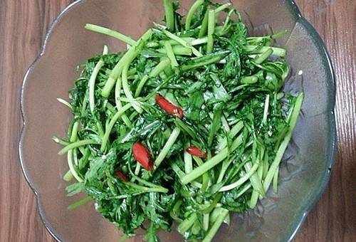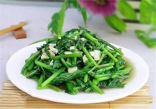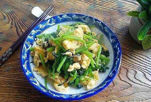 菊花洗凈切成楔形,用開水焯30秒撈出。雞蛋2個打散,加入蔥花和胡椒粉,翻炒均勻,炒至軟爛裝盤。熱油鍋爆香大蒜,加入菊花、炒好的雞蛋和鹽翻炒均勻。