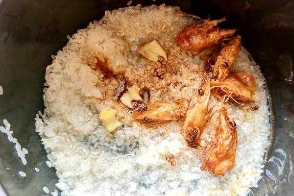 第二步,大米淘洗幹凈放入砂鍋中,把蝦頭和蝦油全部放入砂鍋中,同時放入幾片薑片去去腥。