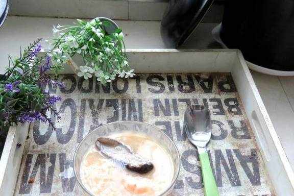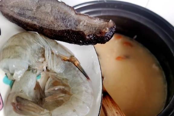 第四步,大概煮半個小時,粥幾乎煮好瞭的時候,放入海蝦尾和海參。