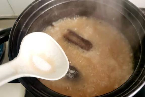 第五步,繼續煮五分鐘,粥就煮好瞭。放鹽和適量米醋調味後即可食用。