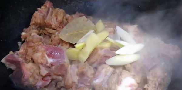 4.然後,把醃制好的肉倒進鍋裡去,先給排骨上一點色,接著炒幹肉裡面的水分,倒入大料一起翻炒,炒好後往裡面加入適量的水,大火煮開後轉中火,給它燉四十分鐘。