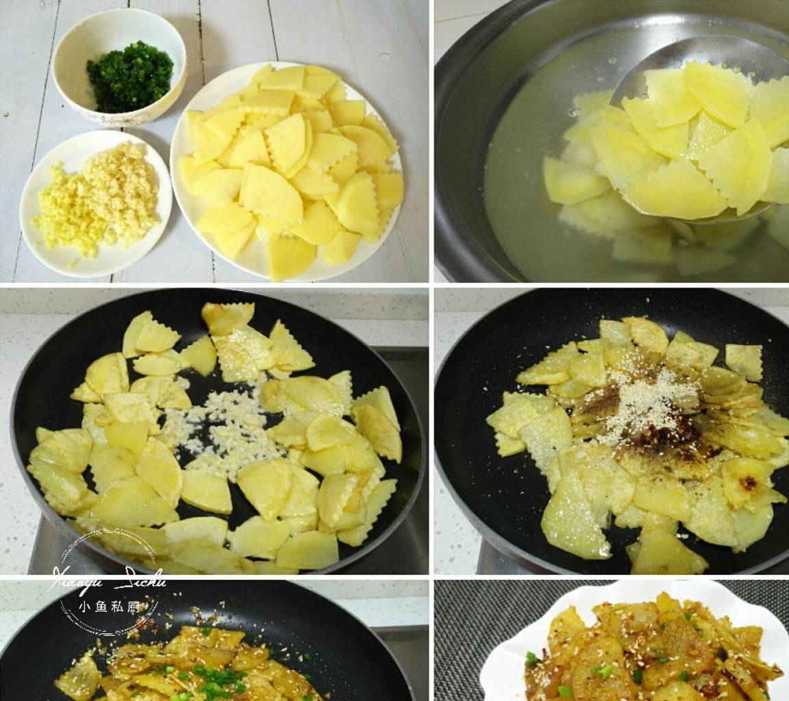1,土豆去皮切片,用清水洗幾遍。薑蒜切末,蔥切粒。