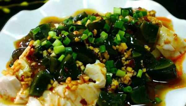 3,豆腐橫豎切幾刀,扣入盤子中,放入皮蛋,淋上調好的醬汁,撒上蔥花,拌一拌即可。