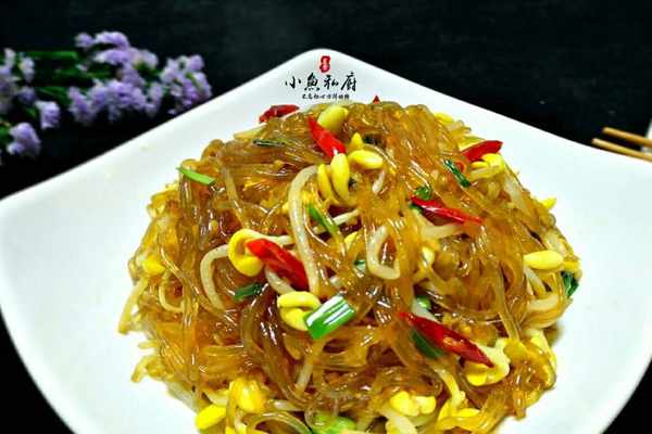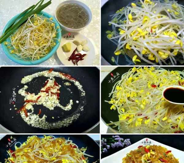食材:黃豆芽200克紅薯粉絲50克大蒜苗大蒜薑幹辣椒(適量)