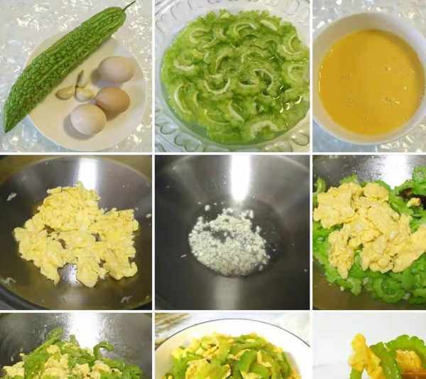 3,鍋裡留少許底油,放入大蒜爆香,加入苦瓜翻炒幾下,放入雞蛋,調入少許鹽,半勺蠔油,翻炒均勻起鍋。