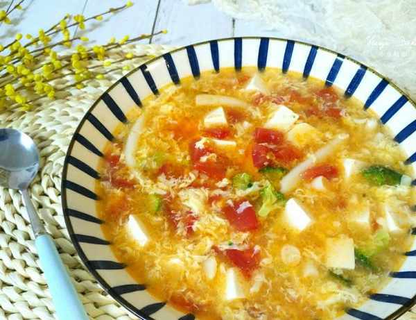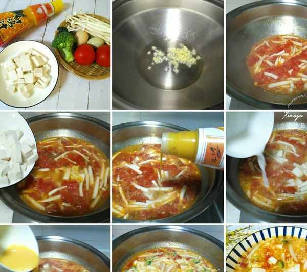 食材:嫩豆腐1小塊番茄2個雞蛋2個白玉菇1小把西蘭花1小朵薑