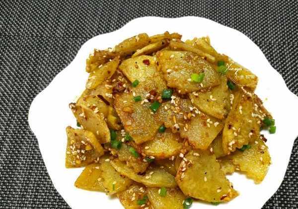 3,不粘鍋裡放少許油,下入土豆煎至兩面焦黃,關火。調入鹽,孜然粉,燒烤料,辣椒油,熟芝麻,拌勻起鍋。