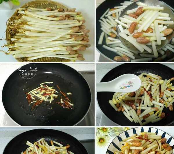 1,花生芽摘掉根部,切成寸段,洗凈。幹辣椒切絲,薑切絲。