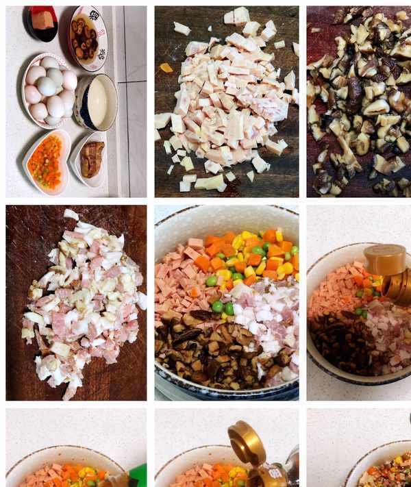 1??午餐肉切碎,泡軟的香菇切碎,泡好的臘肉切碎。