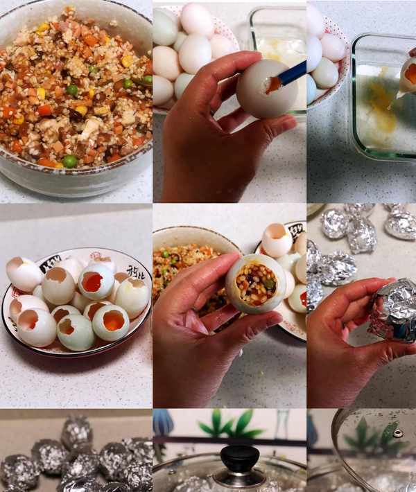 4??把攪拌好的糯米,盛入蛋中,糯米用手按實一點,蒸出的蛋才不會空。這些食材灌瞭15個鴨蛋後,還剩一點,於是我又做瞭5個雞蛋的。