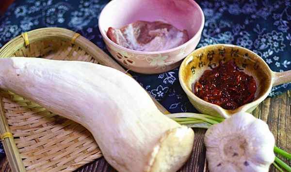 【醬杏鮑菇材料】杏鮑菇1個,蒜2瓣,豆瓣醬1勺,小蔥少許,豬肉100克,胡椒粉少許,