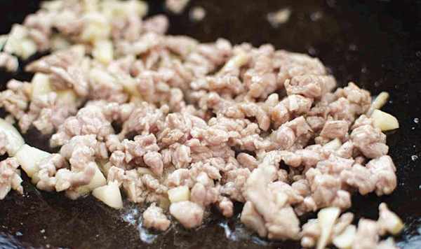3、鍋內留底油,放入蒜頭和肉末炒香。