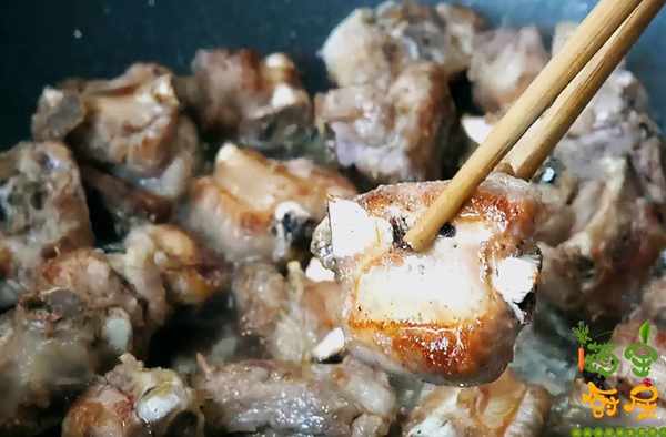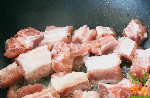 第五步:鍋中留少許的底油,倒入100毫升的水,下入剛才準備好的一半冰糖,用水炒冰糖,這樣能減少排骨的油膩感,一直用小火炒,不停的攪動,炒至深黃色,下入煎好的排骨,迅速翻炒,讓排骨裹上糖色。