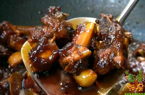 第六步:加入蒜塊,加入大蒜,能夠增加排骨的蒜香味,口感也會更加有層次,炒香後加入蔥薑,蔥薑可以有效地去除排骨的腥味,增加肉香味。炒香後把準備好的料汁順著鍋邊倒入,接著把剩餘的一半冰糖倒入,加入兩三個八角,鍋中油溫持續升高的過程中,八角的香味釋放出來,被排骨吸收。這樣的排骨吃起來特別的香。