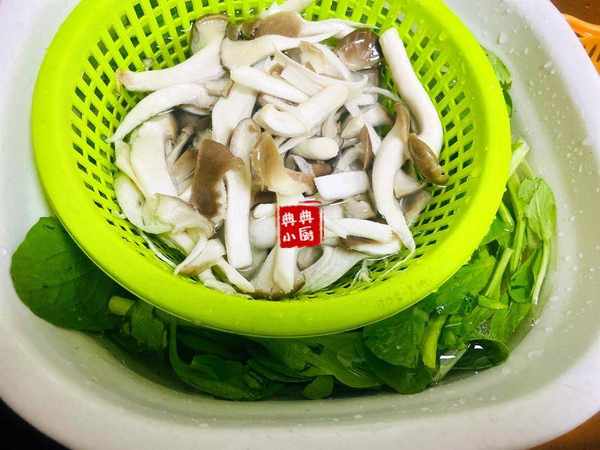 蘑菇和青菜沖洗幹凈,再放到鹽水裡泡起來。瘦肉切成薄片,加淀粉食用油抓均勻備用。