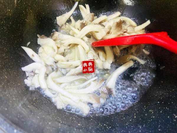 鍋裡先不放油,把蘑菇倒進去炒出水分,再加適量油燒至蘑菇變軟。