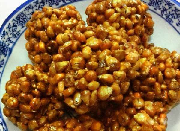 另外一種也是春節時的零食,將苞谷泡兒放到苞谷糖(麥芽糖)稀裡粘上糖,做成拳頭大的球,春節用來待客。