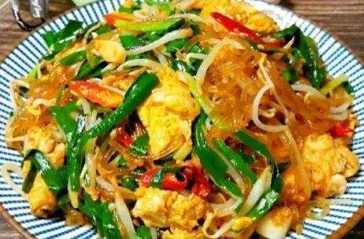 2.熱鍋放油,放入雞蛋液,炒成大塊盛出,再倒入少量食用油,放入蒜末小米辣爆香,倒入綠豆芽,大火翻炒斷生,加入韭菜雞蛋和粉絲翻炒均勻,加入半勺老抽,一勺生抽,一勺蠔油,少量食鹽和雞精調味。