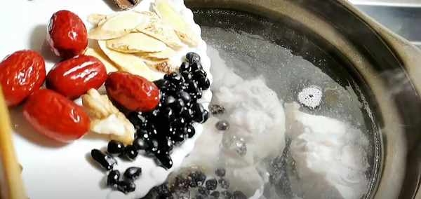 4、在另外一口砂鍋中燒水,把焯過水的豬尾巴,還有前面準備的6種材料,給它全部倒入鍋中,這些藥材都有補腎的作用,也有黑發的作用,水開後撇去浮沫,蓋上鍋蓋,小火煲一個半小時。