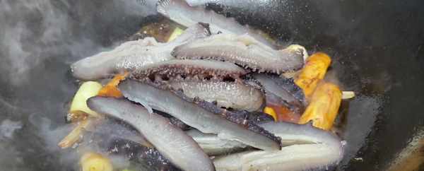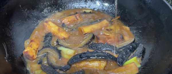 7、將調好的料汁給倒入鍋中,用鏟子翻炒均勻,給它炒香,等炒出香味之後,再把海參倒進去,小火給它咕嘟五分鐘左右。