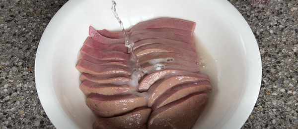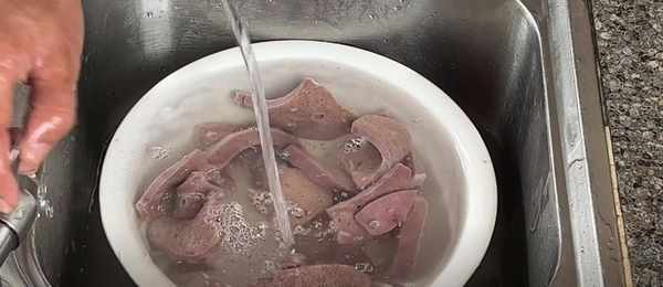 3、豬肝這個時候,也已經醃瞭20分鐘,用流動的清水水把小蘇打的氣質沖掉,把血水也沖幹凈,直到水是清澈的,就可以瞭,用水繼續給它浸泡20分鐘。