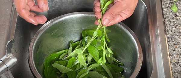 2、把枸杞葉摘下來,放入盆裡,用流動的清水給它清洗幹凈,洗幹凈放一旁備用,記住那個梗也先不要丟,等會還有用。
