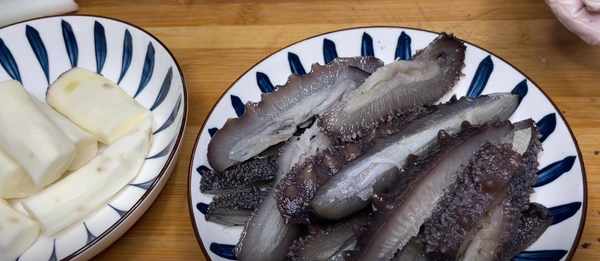 3、將海參清洗幹凈之後,改刀切成長條,其實一分為四即可,海參裡有一層筋膜,不用給它拿出來,這個筋膜也是非常有營養的,全部切成條後,就放盤子裡備用。