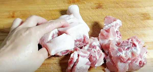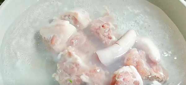 3、把豬尾巴冷水下鍋,煮出一些血水,有人可能接不同意吃豬尾巴,但其實很補,正所謂吃什麼補什麼,它具有豐身材、美容養顏、強健骨骼等功效,中老年人食用,則可延緩骨質老化、早衰,把焯過水的豬尾巴撈出備用。