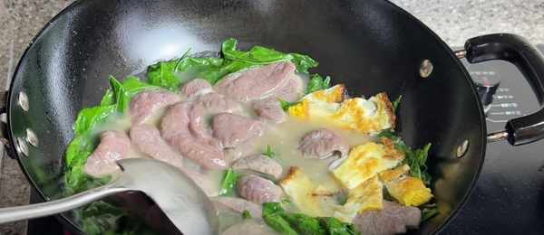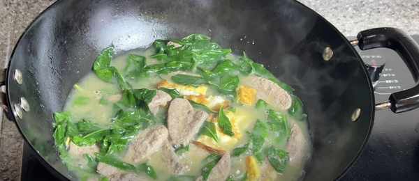 7、等煮出氣質後,將枸杞梗撈出來,再將清洗幹凈的枸杞葉倒下去,接著是醃制過的豬肝,再加入一個提前煎好的荷包蛋。