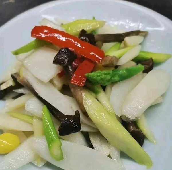 2、鍋底放油山放入山藥片,蘆筍,銀杏仁,雞樅菌,紅椒條翻炒,兌入汁水,放鹽,味精,雞精,雞汁,放入水淀粉,翻炒出鍋淋明油裝盤即可。