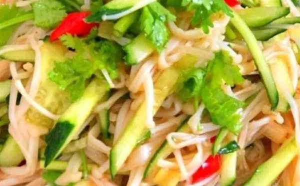 黃瓜,金針菇,香菜,大蒜,鹽,味精,白糖,陳醋,料油,香油,辣椒油,生抽。