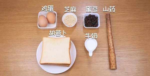 準備食材:雞蛋2個,山藥200克,蜜紅豆60克,牛奶10克,吐司4片,芝麻適量