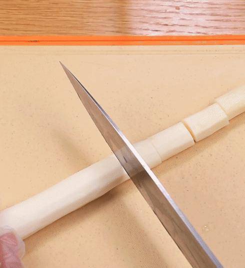 3.取適量山藥泥揉搓成條狀,放到搟好的吐司上,慢慢卷起來,尾端蘸水收口。