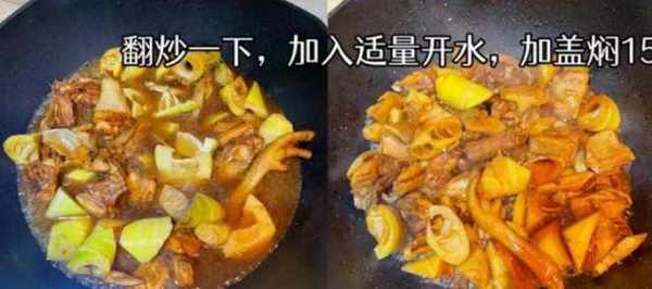 第六步:倒入一些春筍塊,大火快速翻炒一會兒,加上適量開水,蓋上鍋蓋燜15分鐘,將雞肉燜至入味。