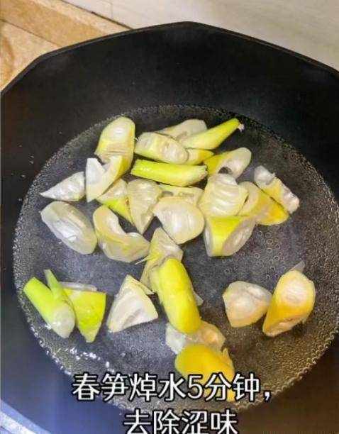 第四步:起鍋放入少許清水,加上一小勺食鹽,倒入一些春筍焯水5分鐘,去掉春筍的澀味,撈出控幹水分,備用。