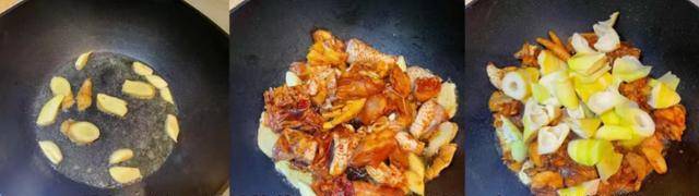 第五步:鍋中加上少許食用油,加上薑片和蒜片爆香,倒入醃制好的雞肉,將雞肉炒至變色。