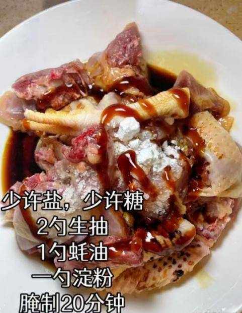 第二步:雞肉洗凈放在碗中,加上一丟丟食鹽和白糖,加上少許生抽和蠔油,最後裹上淀粉,用手反復抓至均勻,靜置20分鐘左右。
