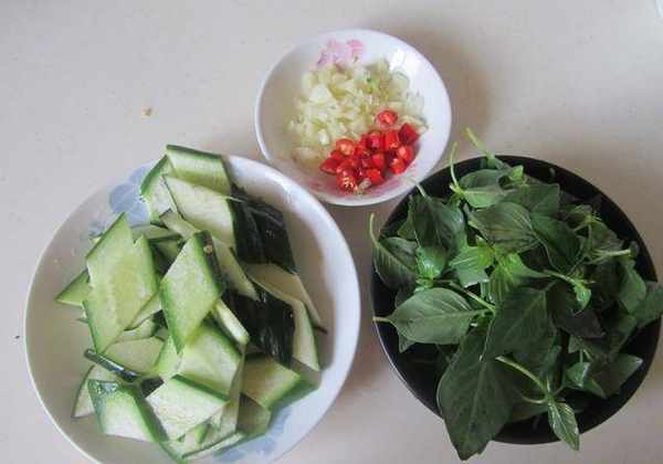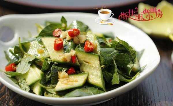 制作:1.摘下新鮮的荊芥葉片,黃瓜切成菱形片,再將紅椒和蒜切成細末備用;