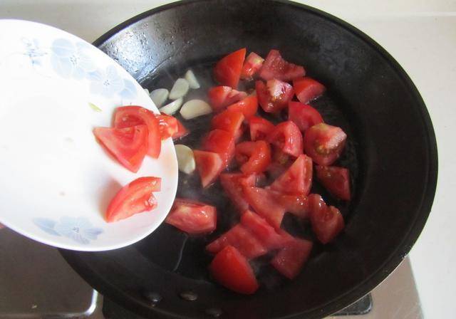 2.加入番茄塊進鍋煸炒,直至將翻炒微微出汁;