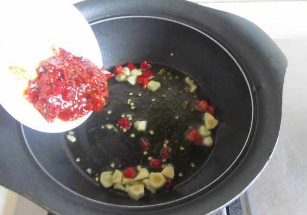 制作:1.九陽蒸煮一體鍋燒熱後放入少許油,將蒜末、紅椒圈和郫縣豆瓣醬煸炒出香味;
