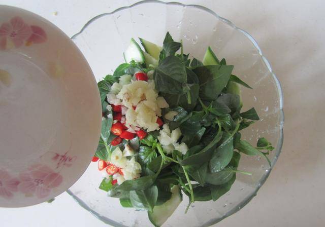 2.將準備好的黃瓜片和荊芥葉片放入大碗中,加入少許蒜末和紅椒;