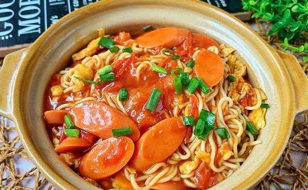 食材:拉面2把、雞蛋2個、火腿1根、番茄2個、2勺玉米淀粉