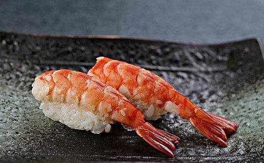 先將所需要的蝦肉煮熟晾涼,再將大米煮熟,拌入醋、糖、鹽等調料做成飯團,將蝦肉放在飯團上面,再用海苔包裹即可。