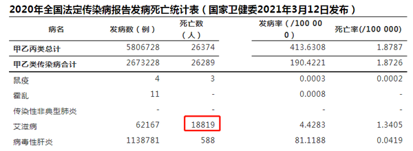 據國家衛健委發佈的《2020年全國法定傳染病疫情概况》顯示,2020 span>年全國因愛滋病死亡的人數為18819,是報告死亡數排名第一的法定傳染病,排名2~5的分別是新冠病毒肺炎、肺結核、病毒性肝炎和狂犬病。