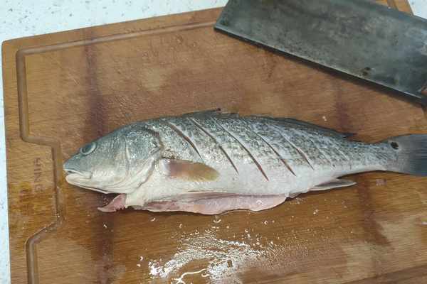 1、把鱸魚表面的鱗片刮洗幹凈,然後開腹去除內臟和魚腹裡的雜質,再用流動的清水多沖洗幾遍,在魚身兩側劃上刀口,方便魚肉成熟和入味。