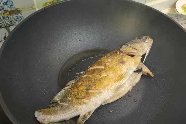 3、炒鍋裡加油,油熱後下入鱸魚,把一面煎至定型、顏色金黃後再翻面煎另一面,把兩面全部煎至金黃後盛出。