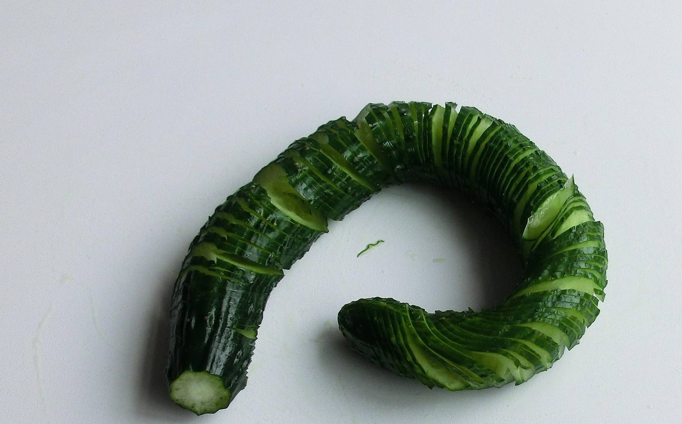 烹飪tips:如果是新手,切蓑衣黃瓜時在黃瓜底下放兩根筷子,這樣切的時候就不容易切斷瞭。再補充一句,黃瓜盡量買直一些的,用西餐刀比較好掌握力度。