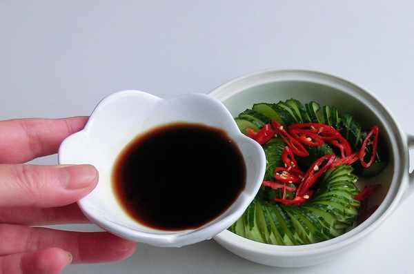 5.醋、鮮貝露、糖、花椒油、香油調入小碗中,把黃瓜中的水分擠出,倒入料汁即可。