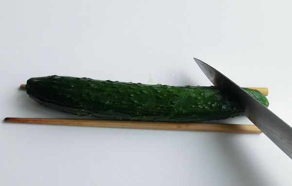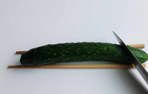 1.將黃瓜反復洗凈,在黃瓜的兩側墊兩根筷子,均勻的切片,片切得越薄,蓑衣黃瓜會拉得越長。
