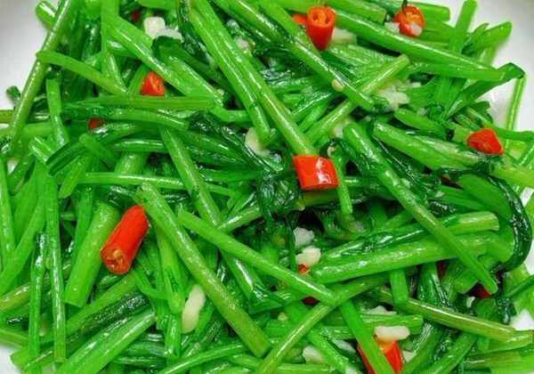 2、起鍋燒油,油熱後放入蒜末和小米辣爆香,再放入空心菜翻炒一會兒,炒至空心菜斷生,就可以放入食鹽調味,快速翻炒均勻入味炒熟即可出鍋裝盤開吃。